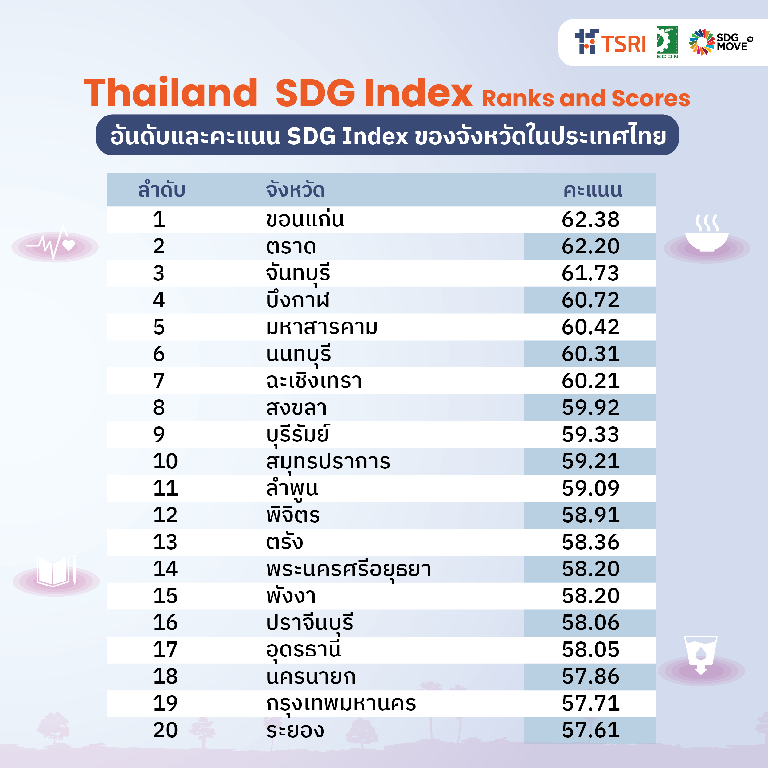 ภาพรวมการบรรลุ SDGs ระดับประเทศของไทย จากการคำนวณพบว่าประเทศไทยมีคะแนน SDG Index เฉลี่ยที่ 54.34 คะแนน โดยแต่ละจังหวัดมีคะแนนอยู่ในช่วง 62.38 และ 32.74 คะแนน โดยจังหวัดขอนแก่น เป็นจังหวัดที่มีคะแนนสูงที่สุด มีค่าเท่ากับ 62.38 คะแนน ในขณะที่จังหวัดแม่ฮ่องสอนเป็นจังหวัดที่มีคะแนนต่ำที่สุด มีค่าเท่ากับ 32.74 คะแนน
