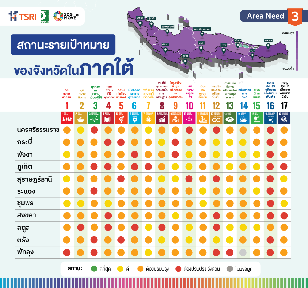 ด้านสถานะผลการดำเนินงานเพื่อบรรลุเป้าหมายการพัฒนาที่ยั่งยืน (SDGs) ระดับจังหวัดในภาคใต้ สะท้อนให้เห็นถึงประเด็นสำคัญ ดังนี้
