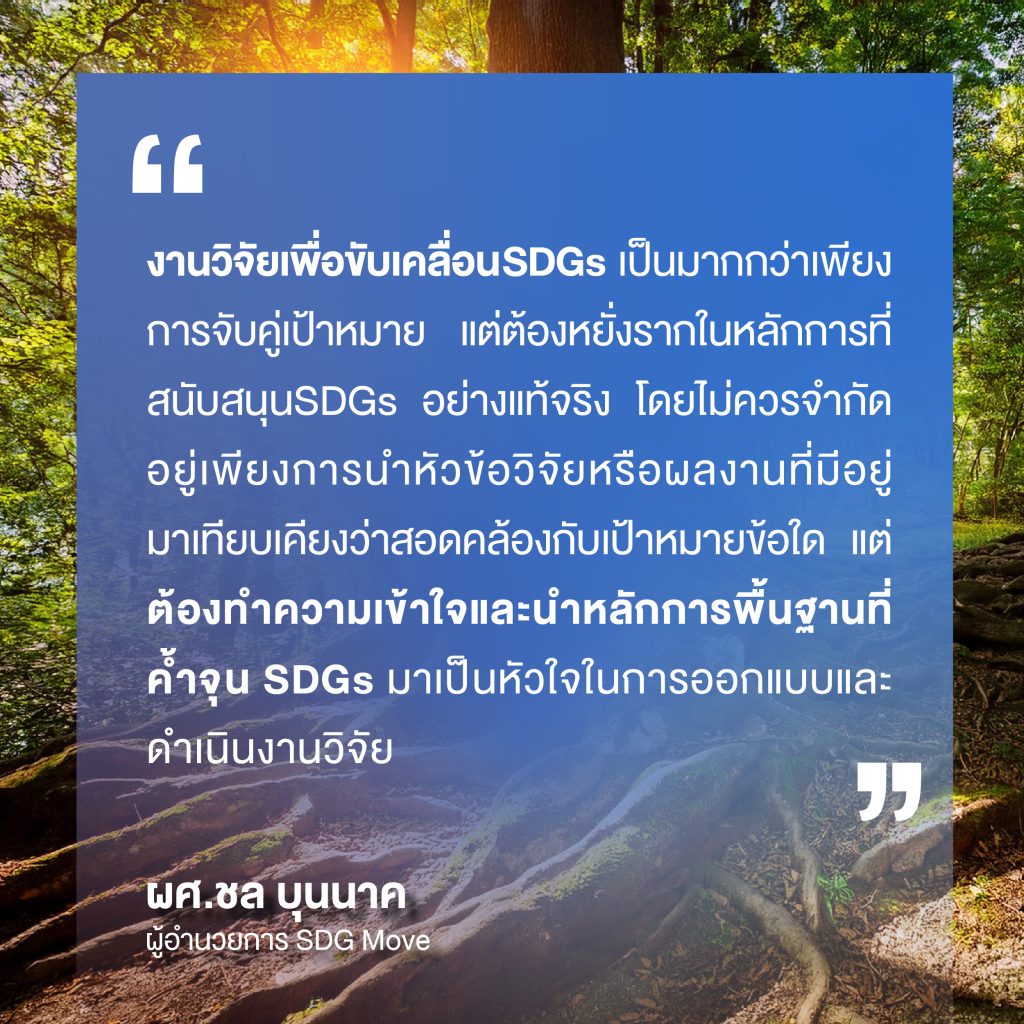 - งานวิจัยเพื่อขับเคลื่อน SDGs เป็นมากกว่าเพียงการจับคู่เป้าหมาย แต่ต้องหยั่งรากในหลักการที่สนับสนุน SDGs อย่างแท้จริง: การดำเนินงานวิจัยในบริบทของ SDGs นั้น ไม่ควรจำกัดอยู่เพียงการนำหัวข้อวิจัยหรือผลงานที่มีอยู่มาเทียบเคียง (mapping) ว่าสอดคล้องกับเป้าหมาย 17 ข้อใดข้อหนึ่งเท่านั้น แต่สิ่งสำคัญยิ่งกว่าคือการทำความเข้าใจและนำหลักการพื้นฐานที่ค้ำจุน SDGs มาเป็นหัวใจในการออกแบบและดำเนินงานวิจัย หลักการเหล่านี้ได้แก่ ความยั่งยืน (Sustainability) ที่มองผลกระทบระยะยาว ความครอบคลุมและการไม่ทิ้งใครไว้ข้างหลัง (Inclusivity and Leave No One Behind) ที่คำนึงถึงกลุ่มเปราะบางความสามารถในการปรับตัวและรับมือ (Resilience) หรือ “การตั้งรับปรับตัว” ต่อการเปลี่ยนแปลง และการเคารพสิทธิมนุษยชน (Human Rights) งานวิจัยที่แท้จริงจึงต้องสะท้อนจิตวิญญาณเหล่านี้ในทุกกระบวนการ ตั้งแต่การตั้งคำถาม การออกแบบระเบียบวิธีวิจัย การดำเนินการ จนถึงการนำผลลัพธ์ไปใช้ประโยชน์ เพื่อให้มั่นใจว่างานวิจัยนั้นมีส่วนช่วยสร้างการพัฒนาที่ยั่งยืนอย่างแท้จริง