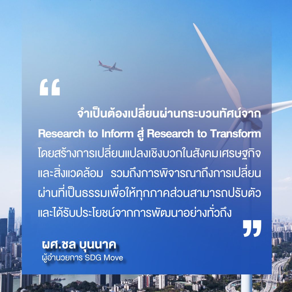 SDG Insights ฉบับนี้ ผศ.ชล บุนนาค ผู้อำนวยการศูนย์วิจัยเเละสนับสนุนเป้าหมายการพัฒนาที่ยั่งยืน (SDG Move) จึงเขียนถึงการพลิกโฉมงานวิจัยเพื่อ SDGs ที่มุ่งหมายมากกว่าเเค่การศึกษาหาคำตอบเเต่วาดหวังไปถึงการสร้างการเปลี่ยนเเปลงที่จะทำให้ความยั่งยืนทางสังคม เศรษฐกิจ เเละสิ่งเเวดล้อมเกิดขึ้นจริงได้