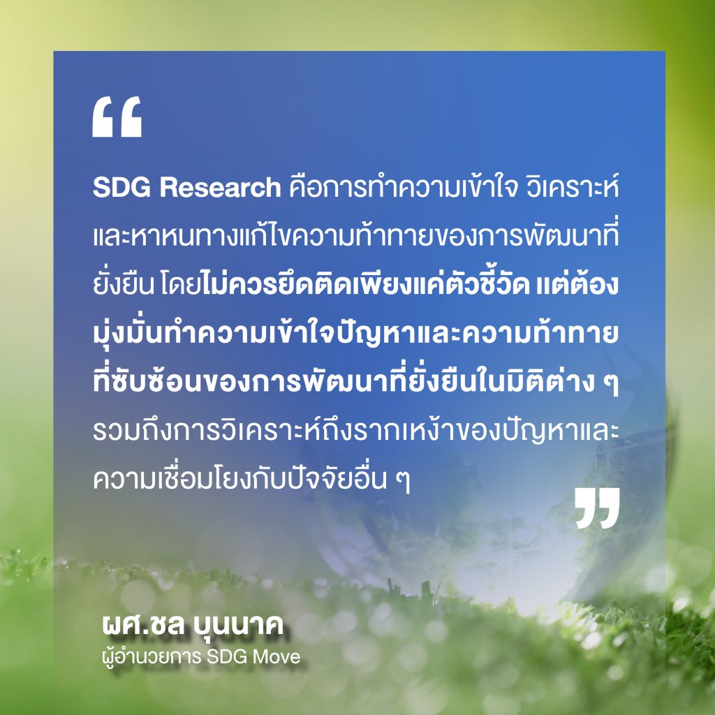 - SDG Research คือการทำความเข้าใจ วิเคราะห์ และหาหนทางแก้ไขความท้าทายของการพัฒนาที่ยั่งยืน โดยไม่ควรยึดติดเพียงแค่ตัวชี้วัด: แก่นแท้ของงานวิจัยที่มุ่งเน้น SDGs คือการมุ่งมั่นทำความเข้าใจปัญหาและความท้าทายที่ซับซ้อนของการพัฒนาที่ยั่งยืนในมิติต่าง ๆ ดังเช่น 6 ประเด็นท้าทายหลักของประเทศไทยที่ได้กล่าวข้างต้น รวมถึงการวิเคราะห์ถึงรากเหง้าของปัญหาและความเชื่อมโยงกับปัจจัยอื่น ๆ เพื่อที่จะสามารถเสนอแนวทางแก้ไขปัญหา (solutions) ที่มีประสิทธิภาพและสอดคล้องกับบริบทได้จริง สิ่งสำคัญคือ นักวิจัยไม่ควรติดกับดักของการมุ่งเน้นเพียงแค่การปรับปรุงหรือเพิ่มค่าตัวชี้วัด (indicators) ของ SDGs เท่านั้น ดังที่บางครั้งอาจพบเห็นในการหารือกับหน่วยงานบริหารจัดการโครงการ (PMUs) ที่มักตั้งคำถามว่า “จะทำอย่างไรให้ตัวชี้วัดนี้ดีขึ้น?” การทำเช่นนั้นอาจทำให้มองข้ามปัญหาเชิงโครงสร้างหรือประเด็นพื้นฐานที่แท้จริงได้ งานวิจัย SDGs ที่ดีจึงควรให้ความสำคัญกับการแก้ปัญหาอย่างเป็นองค์รวม โดยยึดมั่นในลักษณะพื้นฐานและจิตวิญญาณของงาน SDGs