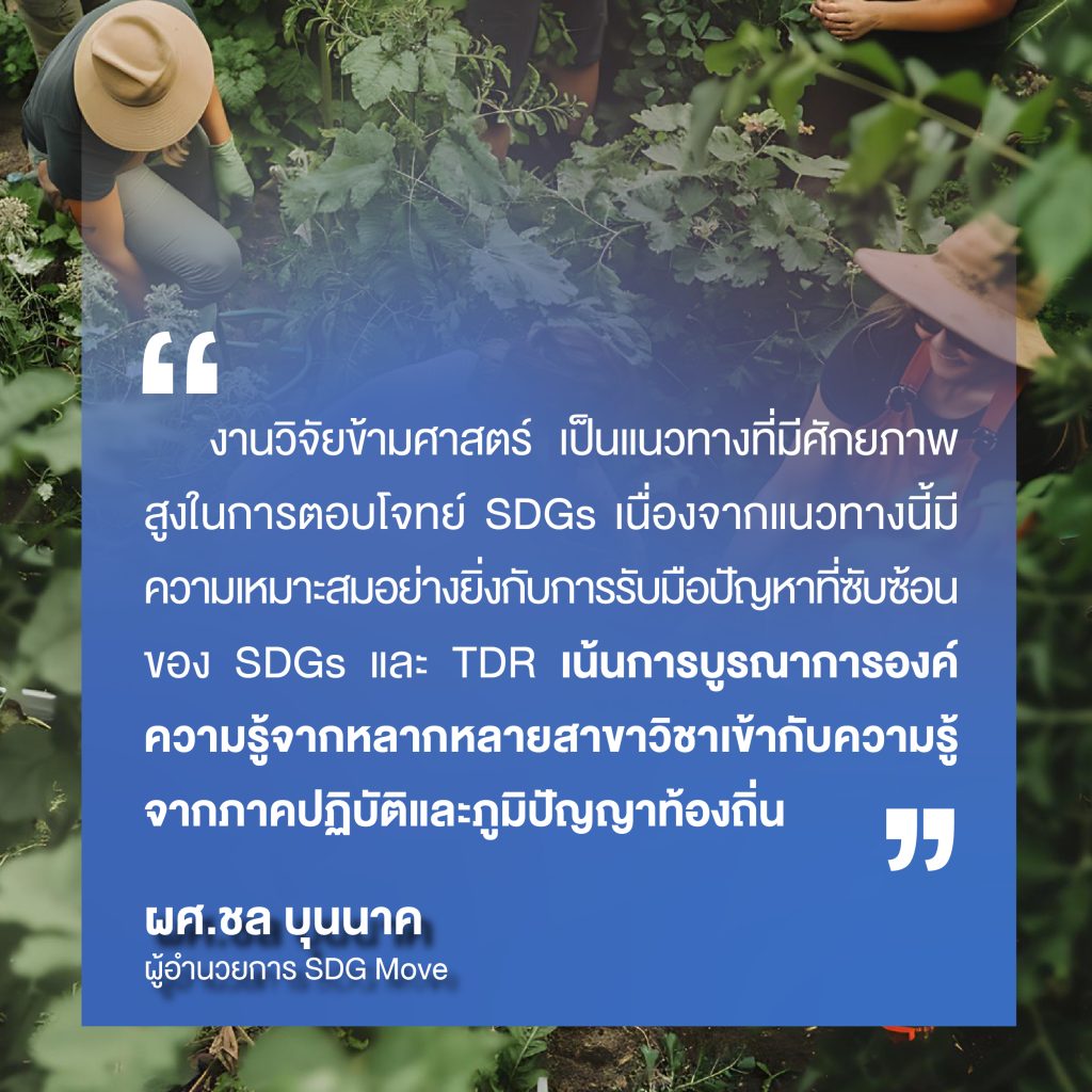 - งานวิจัยข้ามศาสตร์ (Transdisciplinary Research – TDR) เป็นแนวทางที่มีศักยภาพสูงในการตอบโจทย์ SDGs: จากที่ได้อธิบายถึงลักษณะของงานวิจัยข้ามศาสตร์ จะเห็นได้ว่าแนวทางนี้มีความเหมาะสมอย่างยิ่งกับการรับมือปัญหาที่ซับซ้อนของ SDGs และ TDR เน้นการบูรณาการองค์ความรู้จากหลากหลายสาขาวิชา (interdisciplinary) เข้ากับความรู้จากภาคปฏิบัติและภูมิปัญญาท้องถิ่น (societal/local knowledge) กระบวนการ การผลิตความรู้ร่วมกัน (knowledge co-production) ซึ่งให้ผู้มีส่วนได้ส่วนเสียทุกฝ่ายเข้ามามีส่วนร่วมตั้งแต่การกำหนดปัญหา การออกแบบการวิจัย การดำเนินการ จนถึงการนำผลลัพธ์ไปใช้ จะช่วยให้เกิดแนวทางแก้ไขที่สอดคล้องกับบริบทจริงและได้รับการยอมรับจากผู้เกี่ยวข้อง นอกจากนี้ TDR ยังมุ่งสร้างผลกระทบทั้งในเชิงปฏิบัติ (การแก้ปัญหาสังคม) และเชิงวิชาการ (การสร้างองค์ความรู้ใหม่) ซึ่งสอดคล้องกับความต้องการของงานวิจัยเพื่อการพัฒนาที่ยั่งยืน