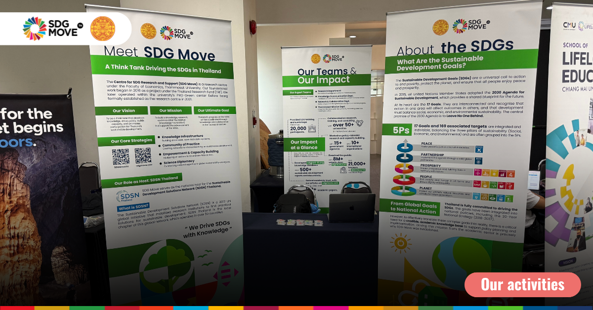 ในงานครั้งนี้ SDG Move ได้ร่วมจัดกิจกรรมใน 2 ส่วนสำคัญ ได้แก่ การออกบูธนิทรรศการเพื่อแนะนำพันธกิจและผลงานของศูนย์วิจัยฯ และร่วมเป็นกระบวนกรในกิจกรรมเวิร์กชอปผ่านการเล่นบอร์ดเกม “2030 SDGs Game”