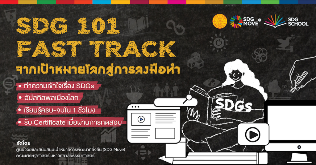 ศูนย์วิจัยและสนับสนุนเป้าหมายการพัฒนาที่ยั่งยืน (SDG Move) จึงขอเชิญชวนทุกคนมาอัปสกิลพลเมืองโลกผ่านกิจกรรม “SDG 101 Fast Track: จากเป้าหมายโลกสู่การลงมือทำ” หลักสูตรการเรียนรู้ออนไลน์ที่สรุปเรื่องราวของ SDGs ในรูปแบบ Podcast อย่างครบถ้วนภายในเวลาหนึ่งชั่วโมง พร้อมแบบทดสอบประเมินความรู้และรับ E-Certificate เหมาะสำหรับนักเรียน นักศึกษา รวมถึงประชาชนทั่วไปที่ต้องการทำความเข้าใจ SDGs อย่างกระชับ เข้าใจง่าย และสามารถนำไปปรับใช้ได้จริง