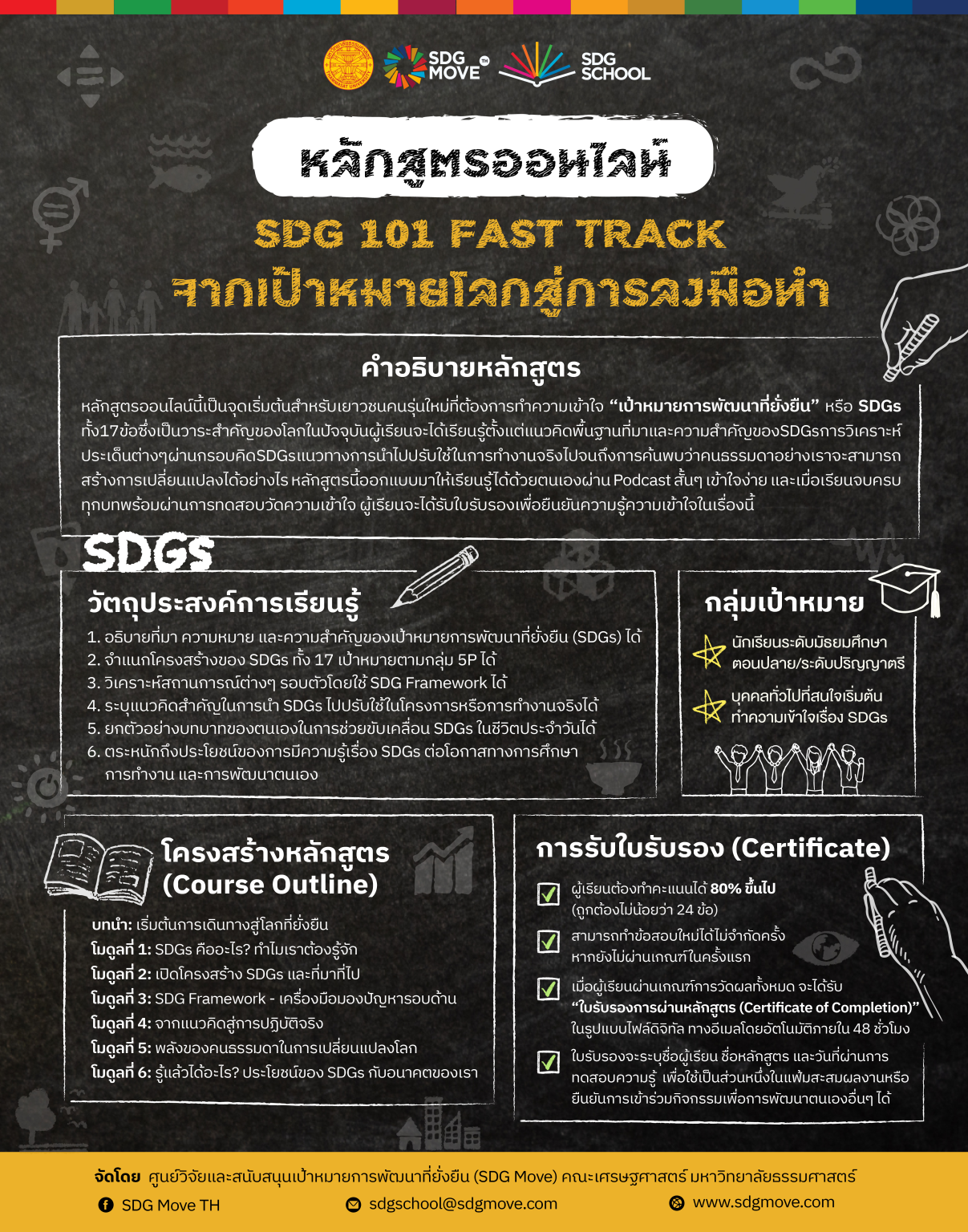 SDG 101 Fast Track เป็นหกิจกรรมหลักสูตรเรียนรู้ออนไลน์ที่ผู้เชี่ยวชาญได้สรุปย่อยเนื้อหาความรู้พื้นฐาน SDGs ที่ซับซ้อนให้กลายเป็น Podcast ที่เข้าใจง่ายจำนวน 6 ตอน (ความยาวรวมประมาณ 1 ชั่วโมง) ให้ผู้เรียนได้เรียนรู้ตามความสะดวกทุกที่ทุกเวลา และเมื่อมั่นใจว่าพร้อม ผู้เรียนสามารถทำแบบทดสอบวัดความรู้ได้ทันที่ เมื่อผ่านเกณฑ์ที่กำหนดจะได้รับ E-Certicate เป็นเครื่องยืนยันก้าวแรกที่สำคัญบนเส้นทางแห่งความยั่งยืน