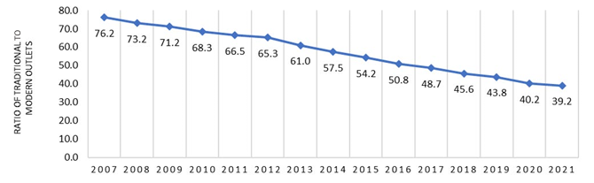 ในปัจจุบัน สินค้าเกษตรและอาหารของไทย เช่นเดียวกับหลายประเทศทั่วโลก ถูกส่งต่อถึงผู้บริโภคผ่าน “การค้าสมัยใหม่” (modern trade) มากขึ้น แทนที่ช่องทางดั้งเดิม (traditional trade) อย่างตลาดค้าส่งและร้านค้าปลีกรายย่อยในภูมิภาคต่าง ๆ ข้อมูลของ UNICEF ปี พ.ศ. 2564 ระบุว่า สัดส่วนการค้าแบบดั้งเดิมในไทยลดลงเหลือเพียงร้อยละ 39.2 จากเดิมที่เคยสูงถึงร้อยละ 76.2 ในปี พ.ศ. 2550 (ตามภาพที่ 5)