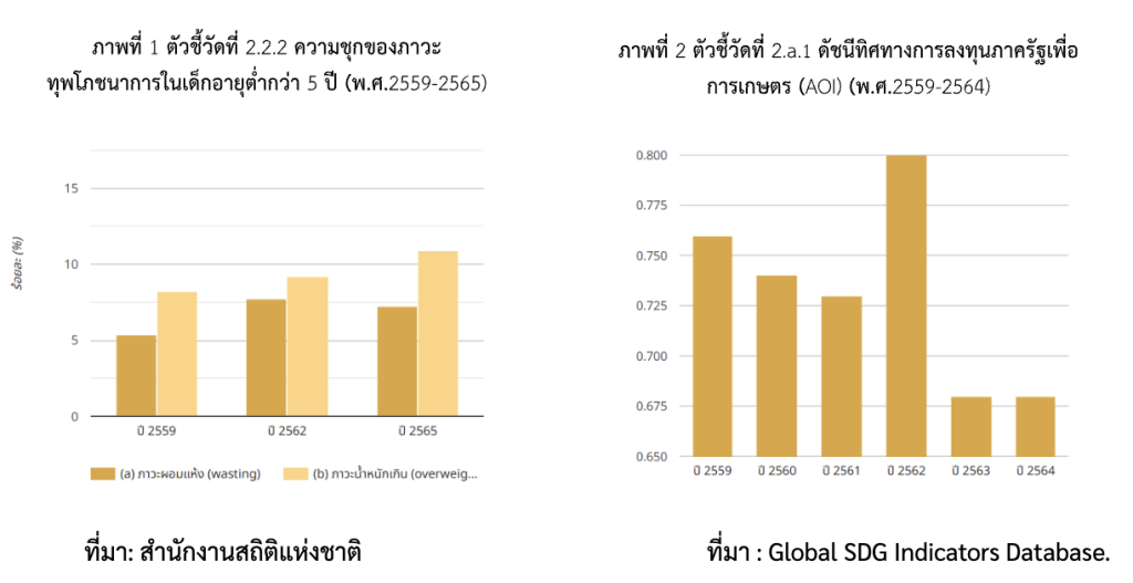 ตัวอย่างเช่น ตัวชี้วัดที่ 2.2.2 ความชุกของภาวะทุพโภชนาการในเด็กอายุต่ำกว่า 5 ปี ที่สัดส่วนเด็กที่มีภาวะผอมแห้งเพิ่มขึ้นจากร้อยละ 5.4 ในปีพ.ศ. 2559 เป็นร้อยละ 7.2 ในปี พ.ศ.2565 หรือสัดส่วนเด็กที่มีภาวะน้ำหนักเกิน เพิ่มขึ้นจากร้อยละ 8.2 เป็นร้อยละ 10.9 ภายในระยะเวลา 6 ปีเช่นกัน (ตามภาพที่ 1)