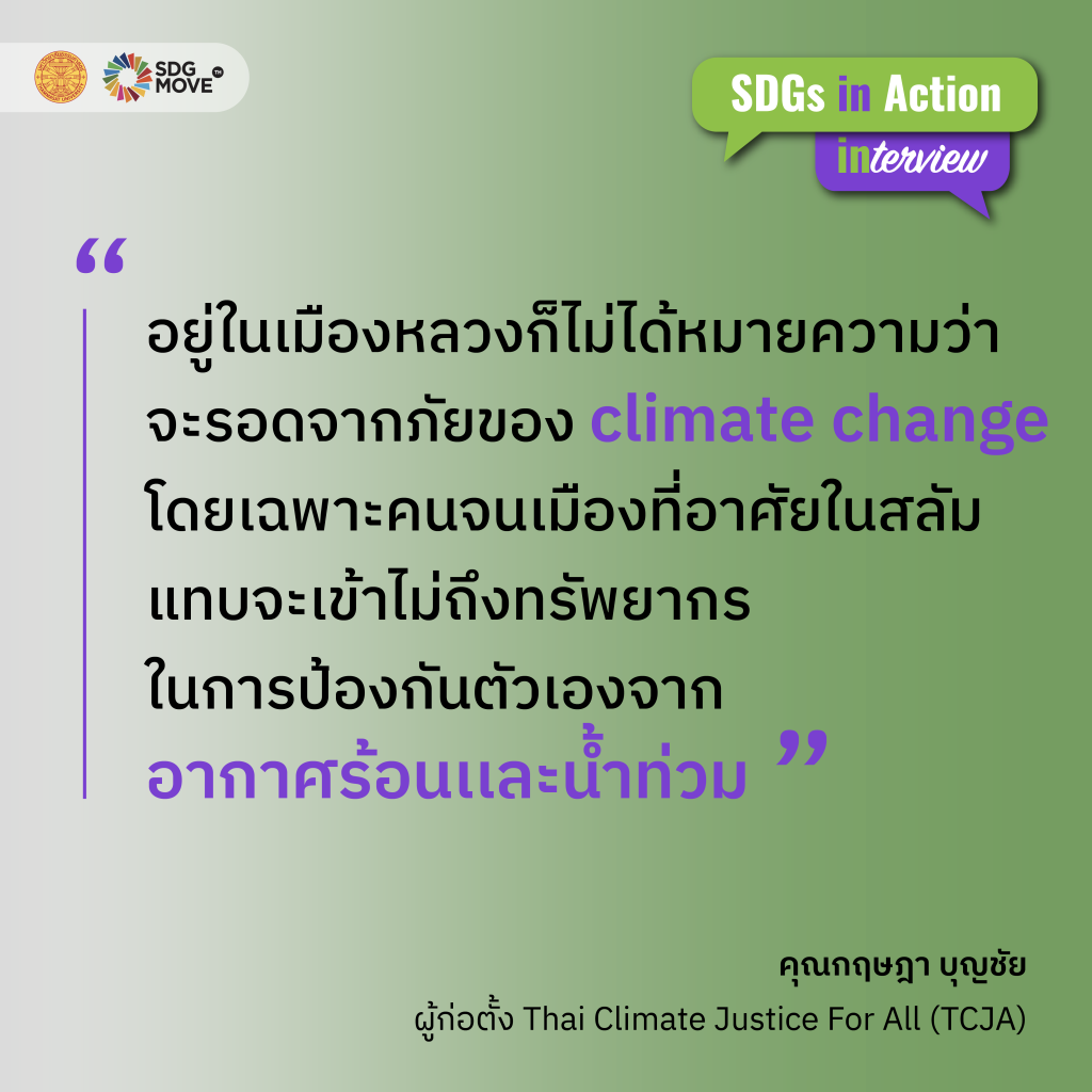 จากพื้นที่สูงสู่พื้นที่เมือง คุณกฤษฎา ชวนให้เห็นว่า ‘คนจนเมือง’ เป็นอีกกลุ่มเปราะบางที่ได้รับผลกระทบจาก climate change โดยอธิบายว่า “ในกรุงเทพฯ ซึ่งเป็นพื้นที่ที่มีความเป็นเมืองสูง พบว่าความเหลื่อมล้ำของฐานะทางเศรษฐกิจค่อนข้างเยอะมาก ดังนั้นแม้อยู่ในเมืองหลวงที่โครงสร้างพื้นฐานดีกว่าต่างจังหวัดก็ไม่ได้หมายความว่าจะรอดจากภัยของ climate change ได้ โดยเฉพาะกลุ่มคนจนที่ไม่มีขีดความสามารถที่จะบรรเทาหรือหลีกหนีได้ เช่น คนที่อาศัยในสลัม ผู้ประกอบอาชีพขับรถจักรยานยนต์รับจ้าง และกลุ่มเด็กอ่อนในศูนย์เด็กเล็ก คนกลุ่มนี้แทบจะเข้าไม่ถึงทรัพยากรในการป้องกันตัวเองจากทั้งอากาศที่ร้อนหรือน้ำท่วมที่มีความเสี่ยงสูงขึ้น”