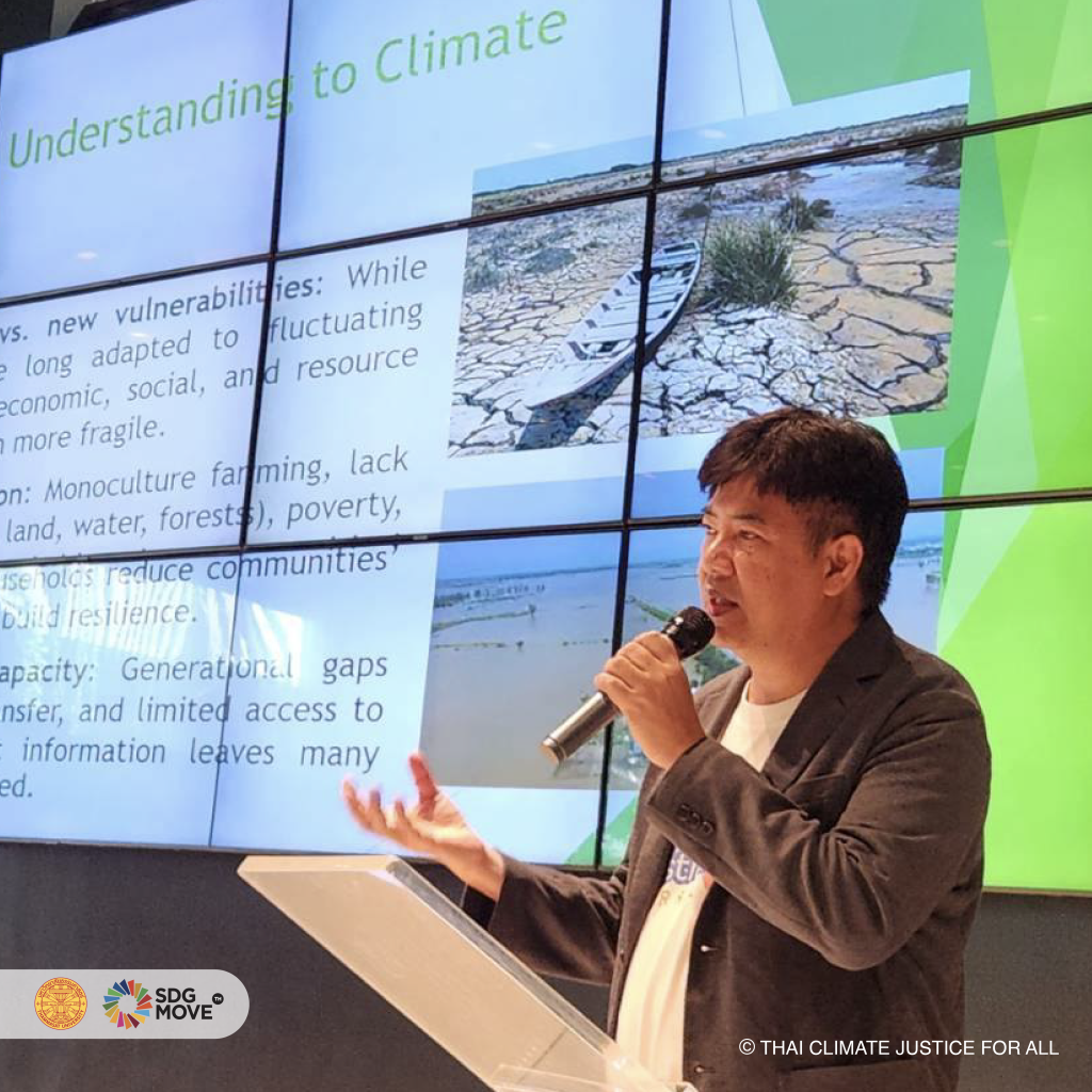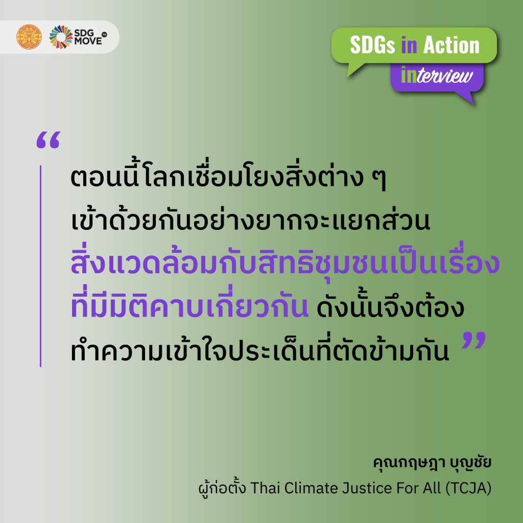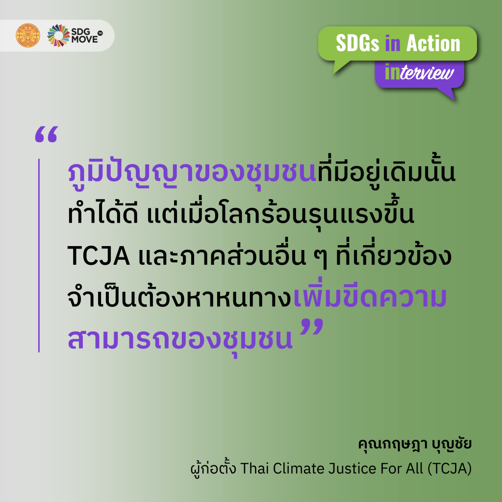 แม้แนวคิดข้างต้นถูกหยิบนำมาถกถึงบ้างแล้วในสังคมไทย แต่ยังไม่เห็นพลวัตการเปลี่ยนแปลงที่เป็นรูปธรรมมากนัก และเมื่อลองสำรวจอย่างจริงจังพบว่า ‘Thai Climate Justice For All (TCJA)’ โครงการภายใต้สถาบันชุมชนท้องถิ่นพัฒนา (LDI) ได้พยายามขับเคลื่อนและสื่อสารเรื่องนี้ให้เกิดขึ้นจริง SDG in Action ฉบับนี้ จึงชวน คุณกฤษฎา บุญชัย ผู้ก่อตั้ง TCJA และเลขาธิการ LDI มาแลกเปลี่ยนถึงที่มาที่ไป ภาพฝัน อุปสรรค และข้อเสนอแนะต่อการทำงานเพื่อหนุนเสริมให้คนทุกกลุ่มถูกนับรวมในสมการของการตั้งรับและปรับตัวต่อการเปลี่ยนแปลงสภาพภูมิอากาศ