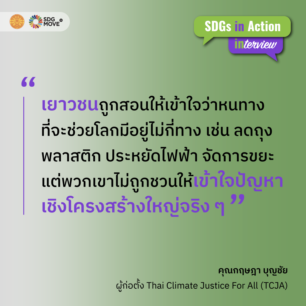 อย่างไรก็ดี คุณกฤษฎา เผยว่าปัจจุบันคนรุ่นใหม่ในประเทศไทยมองเห็นปัญหา climate change แต่รู้สึกว่าไม่มีหวังเพราะคิดว่าปัญหาใหญ่เกินไป เป็นปัญหาของโลก แล้วพวกเขาไม่สามารถทำอะไรได้ ขณะเดียวกันพวกเขาก็ถูกสอนให้เข้าใจเพียงว่าหนทางที่จะช่วยโลกได้นั้นมีอยู่ไม่กี่ทาง เช่น ลดถุงพลาสติก ประหยัดไฟฟ้า จัดการขยะ และถูกสอนให้เข้าใจว่าให้เน้นแก้ไขเพียงแค่ปรับพฤติกรรมบุคคลทั่วไป แต่พวกเขาไม่ถูกชวนให้เข้าใจปัญหาเชิงโครงสร้างใหญ่ว่าจริง ๆ แล้ว 70% ของก๊าซเรือนกระจกนั้นมาจากอุตสาหกรรมพลังงานไม่ใช่ประชาชนทั่วไป ซึ่งจุดนี้จะช่วยให้เข้าใจความเหลื่อมล้ำของสาเหตุและผลกระทบที่ถูกต้องและเชื่อมโยง และสามารถตั้งคำถามเพื่อมองหาแนวทางที่ตรงจุดมากขึ้น
