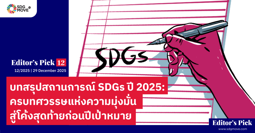เดินทางมาถึงปลายปี 2025 แล้ว ขอบคุณทุกท่านที่ติดตามและสนับสนุน SDG Move มาโดยตลอด ปีที่ผ่านมาคือปีครบทศวรรษของเป้าหมายการพัฒนาที่ยั่งยืน (Sustainable Development Goals) มีเหตุการณ์ต่าง ๆ มากมายที่เกิดขึ้น หากเริ่มต้นจากระดับประเทศ เราต่างตระหนักเห็นแล้วว่าการเปลี่ยนแปลงสภาพภูมิอากาศกำลังคุกคามคนไทยทั่วทุกภูมิภาค ทั้งปัญหาฝุ่นพิษ PM2.5 และปัญหาน้ำท่วมที่เพิ่มระดับความรุนแรงอย่างไม่เคยเกิดขึ้นมาก่อน โดยเฉพาะในพื้นที่หาดใหญ่และภาคใต้ตอนล่างของไทย ขณะที่ชายแดนไทย-กัมพูชา ยังคงมีการสู้รบทางการทหารอย่างต่อเนื่อง ส่งผลให้กำลังพลและประชาชนเสียชีวิต บ้านเรือนเสียหาย และเศรษฐกิจชะงักงัน