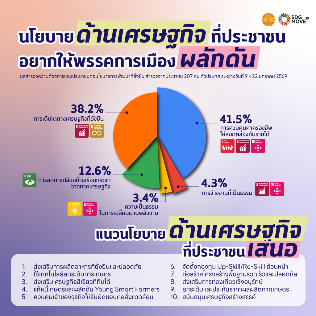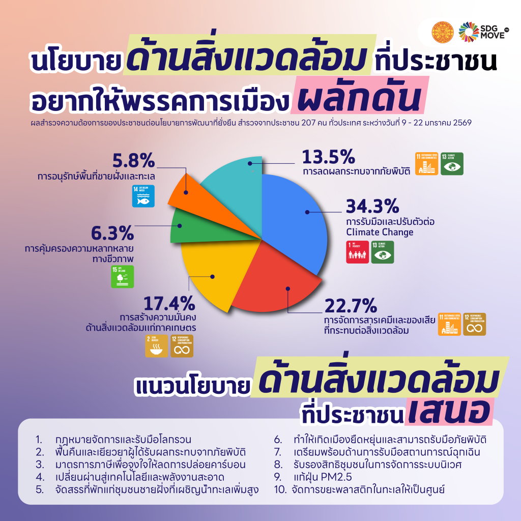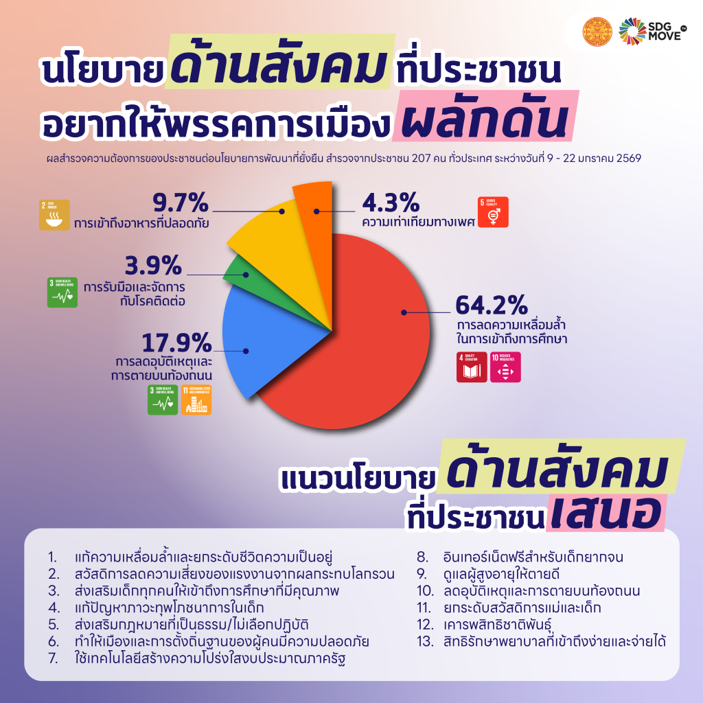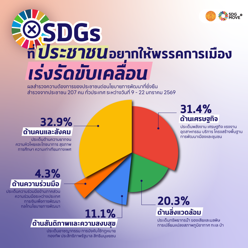 ต้นเดือนมกราคมที่ผ่านมา SDG Move ได้จัดทำแบบสำรวจเรื่อง “ความต้องการของประชาชนต่อนโยบายการพัฒนาที่ยั่งยืน เลือกตั้ง 69” ระหว่างวันที่ 9 – 22 มกราคม 2569 โดยเปิดให้ประชาชนจากทั่วประเทศร่วมตอบแบบสำรวจในรูปแบบสาธารณะ ทั้งนี้ ได้นำความคิดเห็นและการรับรู้จากผู้ตอบแบบสำรวจจำนวนทั้งสิ้น 207 คน มาสังเคราะห์และประมวลผล