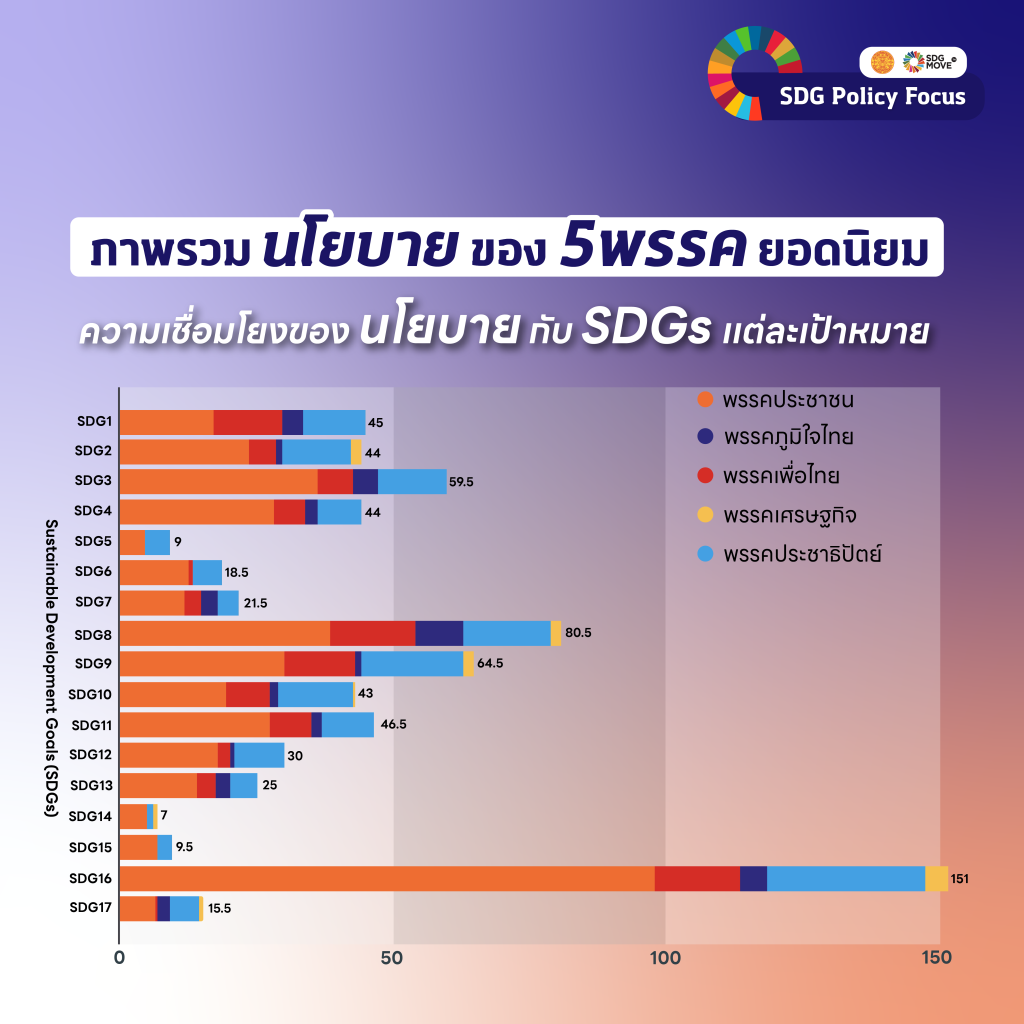 เมื่อพิจารณาเปรียบเทียบจำนวนจุดของนโยบายที่เชื่อมโยงกับ SDGs รายเป้าหมาย พบว่านโยบายที่พรรคการเมืองเสนอในการหาเสียงเลือกตั้งครั้งนี้มีความเกี่ยวข้องกับ SDG16 ความสงบสุข ยุติธรรม เเละสถาบันเข้มเเข็ง มากที่สุด กว่า 151 จุด โดยพบในนโยบายของพรรคประชาชนเป็นอันดับหนึ่ง กว่า 97.5 จุด ขณะที่พบน้อยสุดในนโยบายของพรรคเศรษฐกิจ เพียง 4 จุด