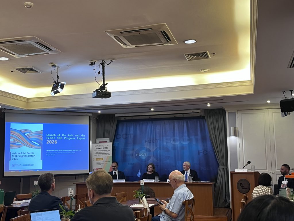 18 กุมภาพันธ์ 2569 – ศูนย์วิจัยและสนับสนุนเป้าหมายการพัฒนาที่ยั่งยืน (SDG Move) นำโดยทีมงานฝ่ายสื่อสารองค์ความรู้ได้เข้าร่วมงานเปิดตัวรายงาน Asia and the Pacific SDG Progress Report 2026 ซึ่งจัดทำโดยคณะกรรมาธิการเศรษฐกิจและสังคมแห่งสหประชาชาติสำหรับเอเชียและแปซิฟิก (UNESCAP) ณ สมาคมผู้สื่อข่าวต่างประเทศ (Foreign Correspondents’ Club of Thailand: FCCT)