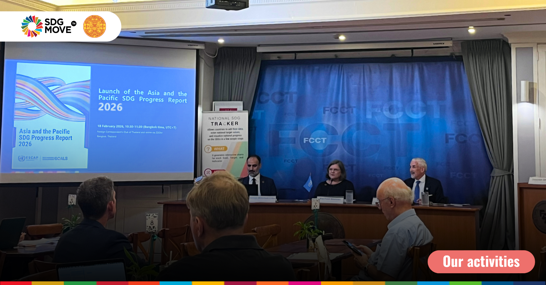 18 กุมภาพันธ์ 2569 – ศูนย์วิจัยและสนับสนุนเป้าหมายการพัฒนาที่ยั่งยืน (SDG Move) นำโดยทีมงานฝ่ายสื่อสารองค์ความรู้ได้เข้าร่วมงานเปิดตัวรายงาน Asia and the Pacific SDG Progress Report 2026 ซึ่งจัดทำโดยคณะกรรมาธิการเศรษฐกิจและสังคมแห่งสหประชาชาติสำหรับเอเชียและแปซิฟิก (UNESCAP) ณ สมาคมผู้สื่อข่าวต่างประเทศ (Foreign Correspondents’ Club of Thailand: FCCT)